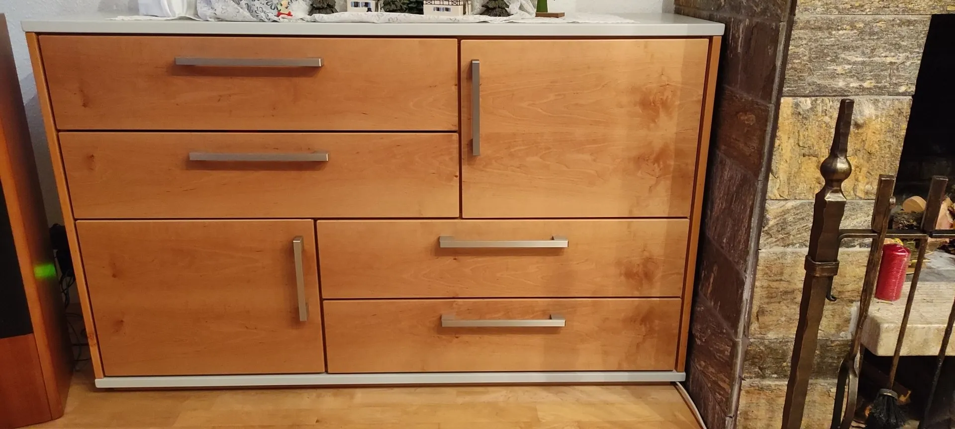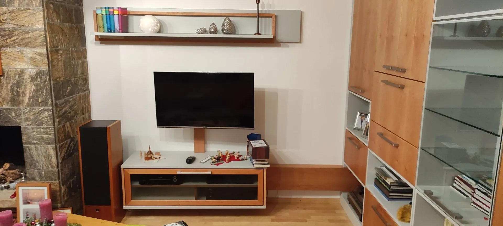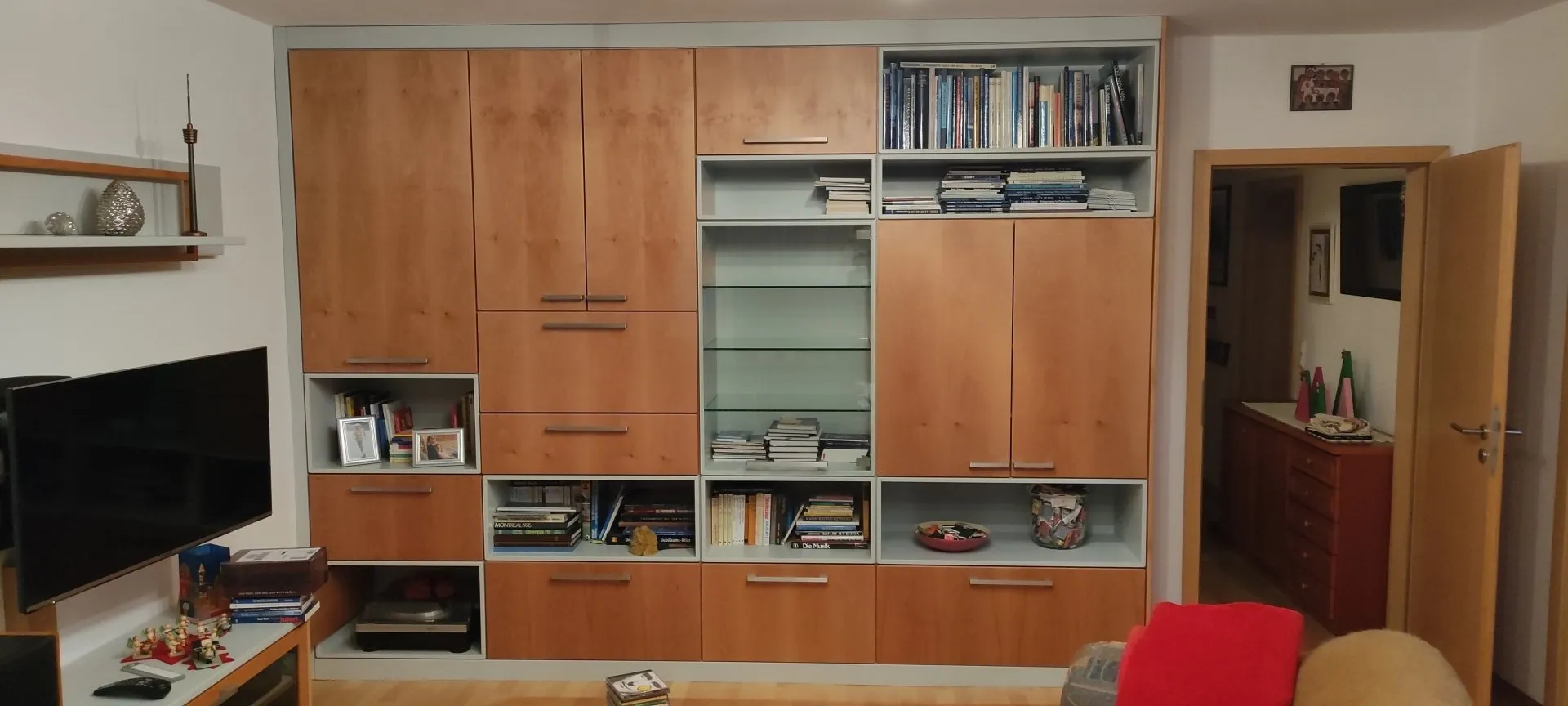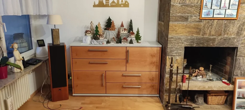 Passend zum bereits vorhanden Esszimmerschrank, wurde hier eine Wohnzimmereinrichtung entworfen, welche die Designsprache aufnimt, jedoch auch eigene Komponenten einbringt und die Konstruktion erweitert.